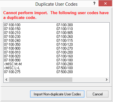 At this time the user has two choices remove/fix the duplicates from the NEW database or click the Import Non-duplicate (name of database). This will allow all non-duplicated codes to be merged.