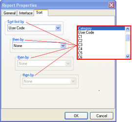 – Depending on the Report Type selected the number of levels may change. In fact for one report the Sort tab is replaced by the Condition tab, this will be explained in a moment. When you open the Sort dialog click the droparrow. A list of fields that The EDGE can sort on appears.