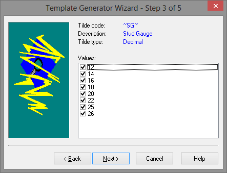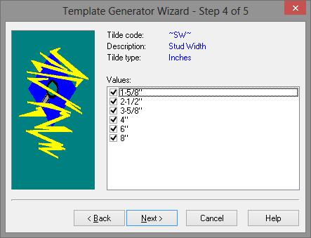 The last field from the Match Codes is the ~SW~ or Stud Width field. Just like the stud gauge field select the various widths you want to templatize uncheck those that you do not. The number of steps between start and finish will vary depending on the number of variables (lines) in the item’s Match Code field. After making you selections click Next.