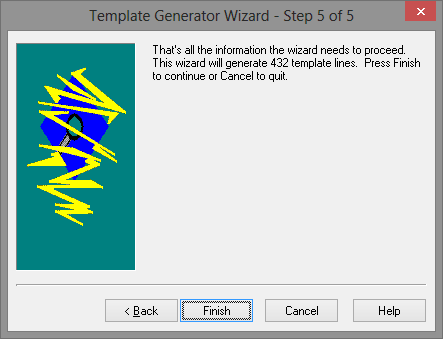 As you can read in the screen to the right that’s all the information the Template Generator needs to proceed. You can also read that based on our criteria The EDGE will generate 432 template lines. The reason this number is lower than the 1500 previously mentioned is that we did not include ~SL~ Stud Length. Press Finish or Cancel to continue.