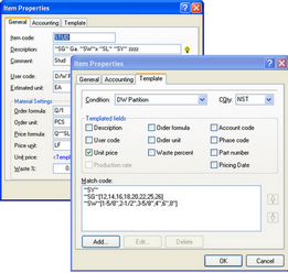 This step is not necessary but because this a first time we will open the Item Properties screen. We then selected the Template tab so that you may see the setup before we open the Template Wizard. Pay particular attention to the Match Code field. This will come into play when you set up your wizard. Close the Item Properties dialog. Click the Template Tab and open the Item Template screen.