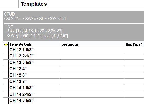 If you go back and look at the second row above and check the Match Code field this screen is the first Tilde code. The ~SY~ or Stud Type field. What you see listed are the different stud types that have been setup in the Stud Type Lookups database. As we want to templatize the METAL studs every line except the CH and CT can be deleted. Click Next when finished.