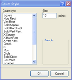 Within a drawing you may want to count things to include them in estimate calculations. For example, you may have five drains on a roof that you want to include. The program will cycle through the count styles from top to bottom, and you can change the order by selecting a style, and pressing the Up or Down arrow to move through the list. You can Add, Edit, or Delete styles using the respective buttons in the dialog. when you select Add or Edit, you will open a dialog in which you will set the count style and the size of the count indicator.