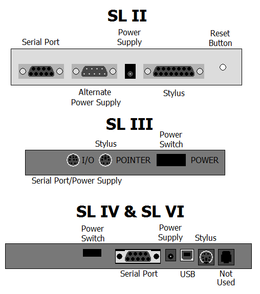 – The SL II series has a power supply, a 9 pin serial cable and a cursor (either a stylus or puck)