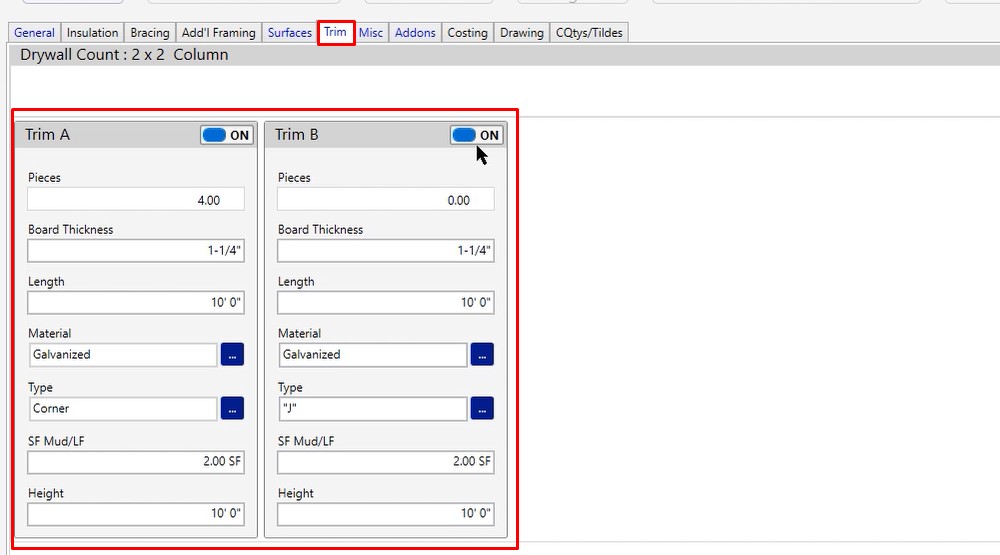 This is going to be what we’re using to calculate your corner bead. In this case, you’ll notice that we have two different trim options. Trim A is the only one that is currently populated with trim.