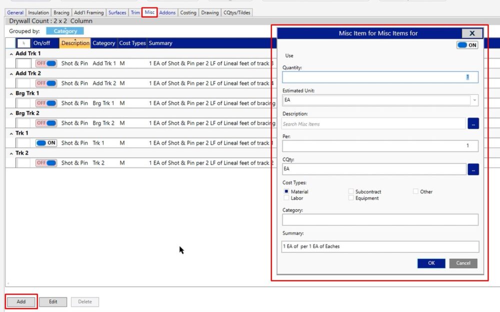 The miscellaneous tab is a catchall for everything that we haven’t completed inside of the other tabs. That could be material, labor, equipment, subcontractors, it could even be other tax classifications for items.