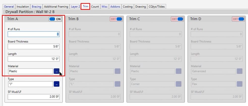 Trim A, B, C, and D, are the same, but ultimately choose whatever one you may need for this project. Turn that one on and the other one off. Or if you needed to have two different trim pieces, feel free to turn both of them on. As you measure in the take off screen, whatever is turned on here will be calculated for you.