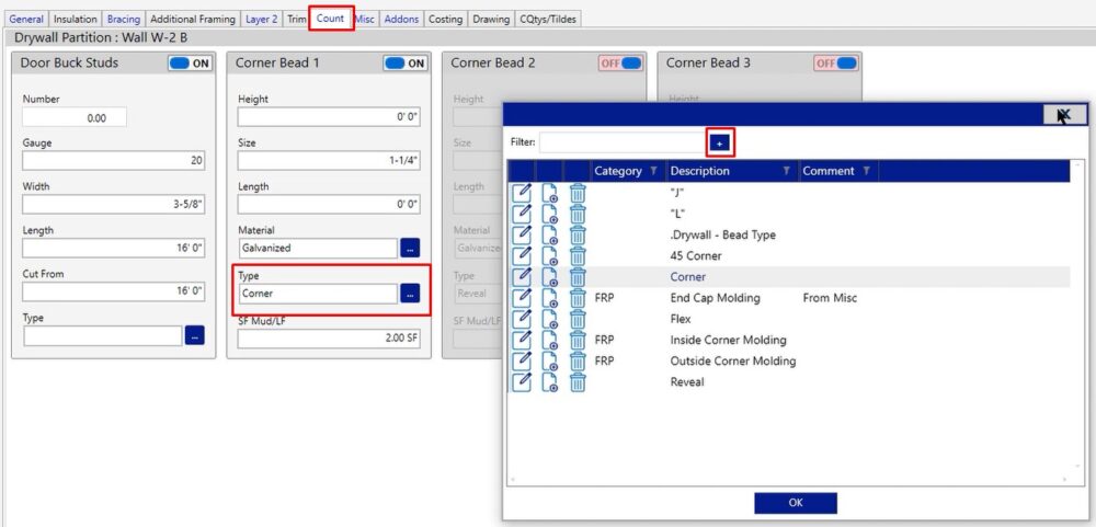 Inside of your partition condition, you do have the capability to count corner bead as well as door buck studs. Realistically, it’s up to you whether you want to use the count tab inside of the drywall partition condition. You can measure it separately if you would like.