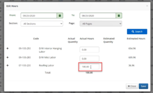 To demonstrate this situation, let’s say we’re on our Labor Screen and we have inputted 100 hours through Bulk Upload, or even by adding hours to my roofing labor code.