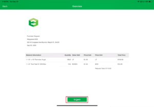 - A purchase request will generate and appear, tap the submit to send the document to internal personnel.