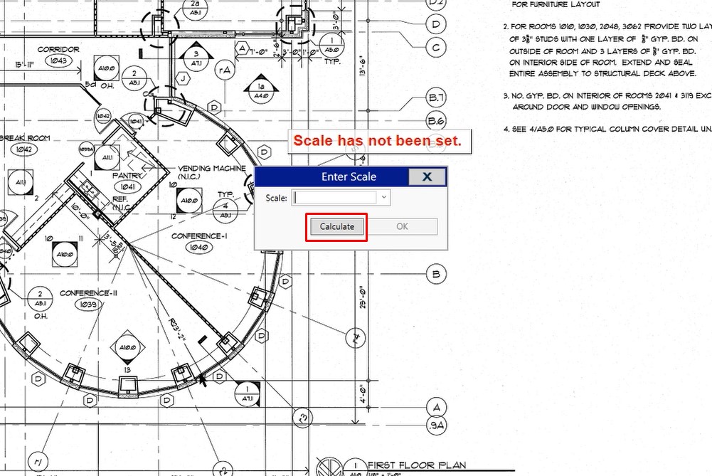 When you first access the takeoff screen inside of your project, you’ll notice that we display a message that says the scale has not been set. We are aware that a lot of architects will provide you a scale at the bottom of an image, however, we prefer that you calculate your scale based off of a known dimension on that image.