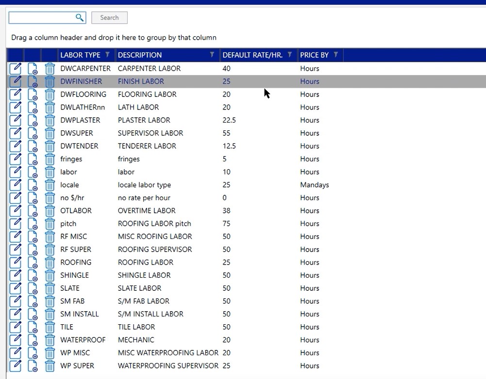 In this case, if we open up our labor types, you’ll notice that we have quite a few different labors and there’s a cost per hour there. This is how you’re going to change that cost per hour for every project from this point moving forward.