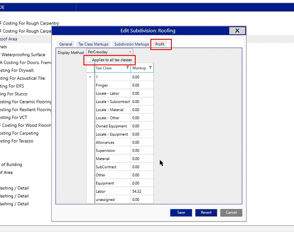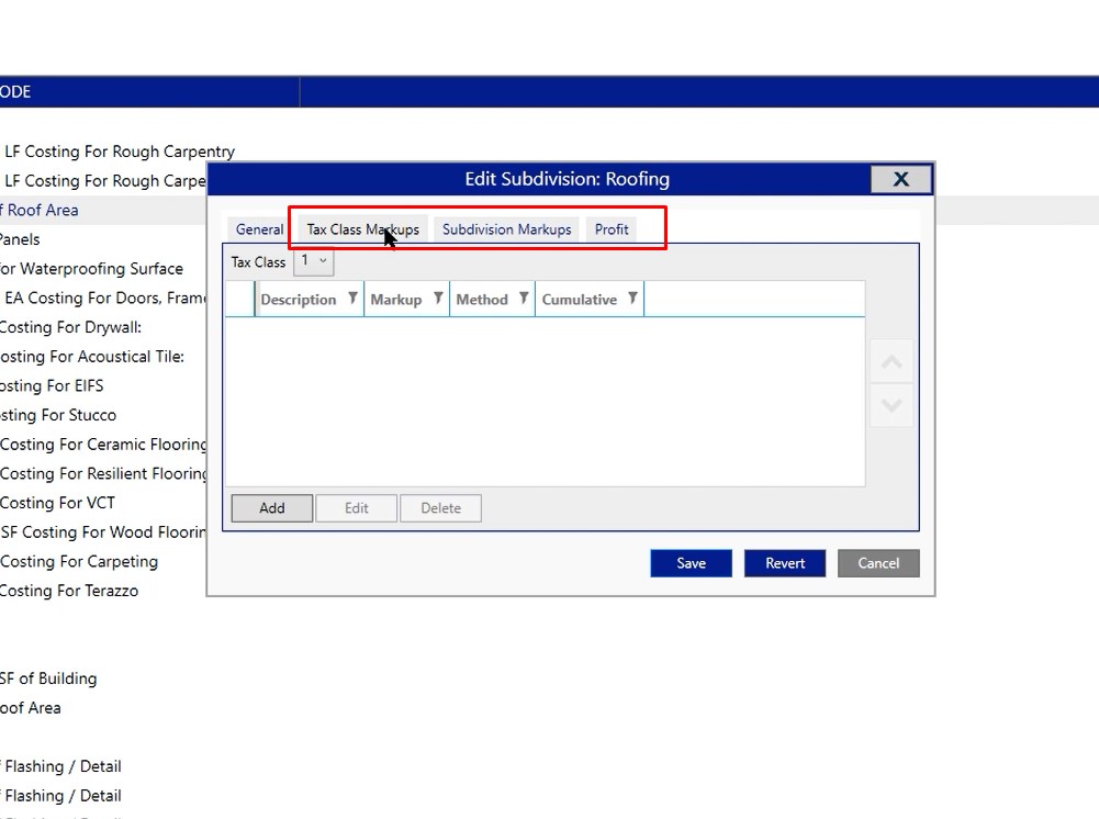 Once you open the properties, you’re going to be working with the three tabs across the top; tax class markup, subdivision markups and profit.