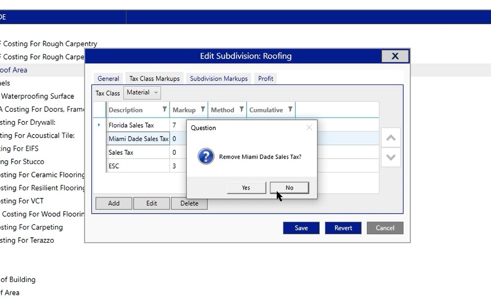 Now you can go through and edit any of those markups that are in there by default. If you need to add or delete you also have that capability by just left clicking. Click on the option, choose delete and say yes. What you’re doing is making a change to that specific subdivision. So any job from this point forward that you create is now going to be reflected upon what you’re seeing here.