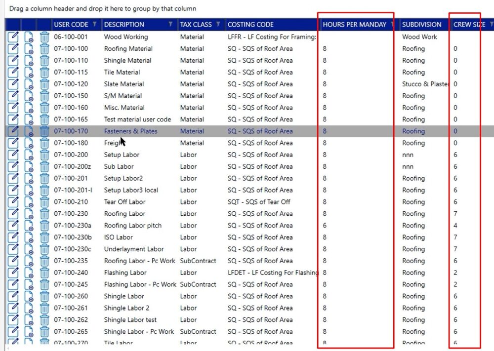 In this case, if you double click on a user code, you’re going to be able to make modifications to any of this information. So in this case, you can change the hours per manday and you can also change the crew size when you’re looking at labor.