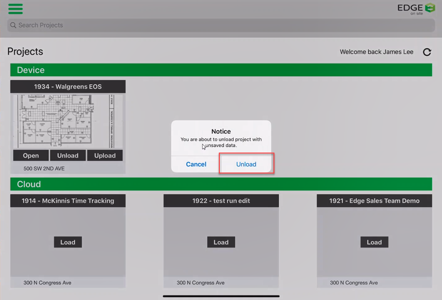 - A pop-up will appear, informing you are about to unload a project with unsaved data, tap Upload.