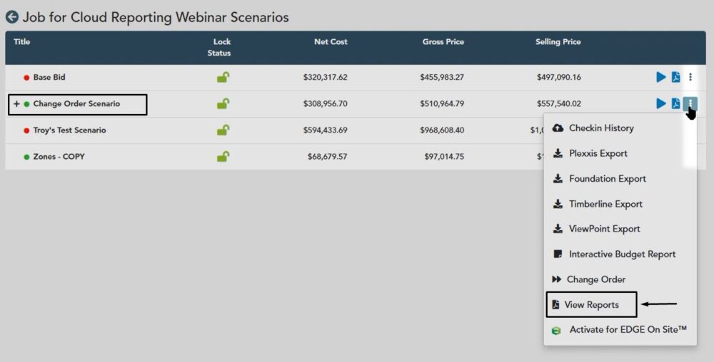 In this example, you’ll notice that we have our change order scenario. Click the three dot button, then choose view reports.