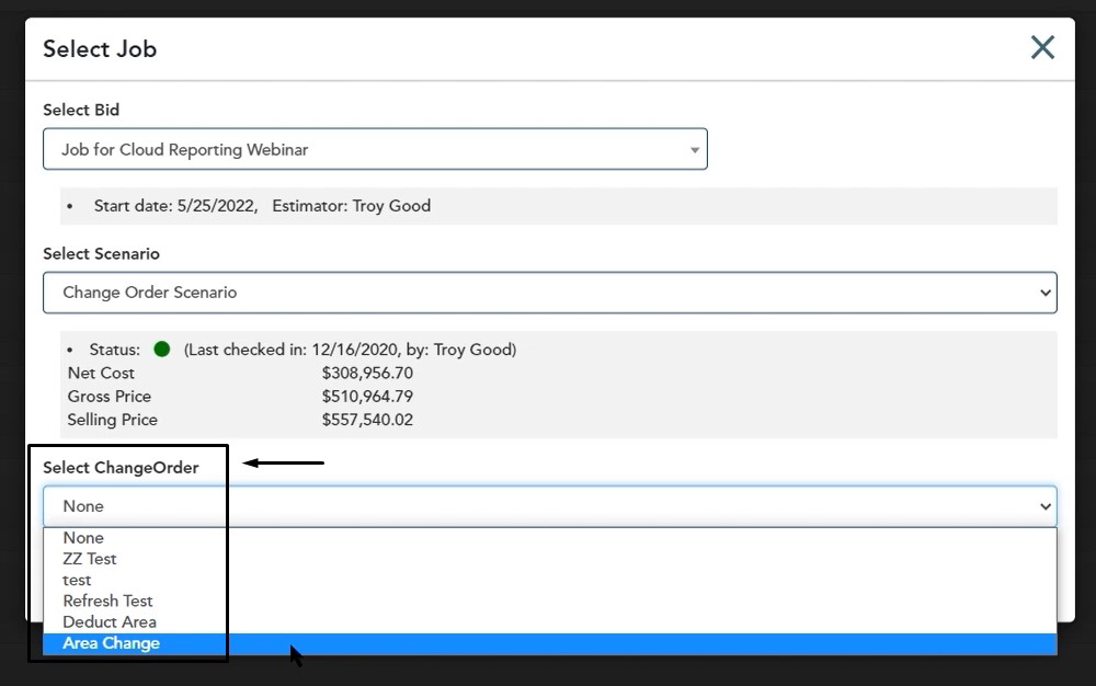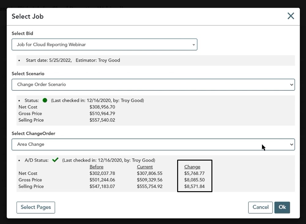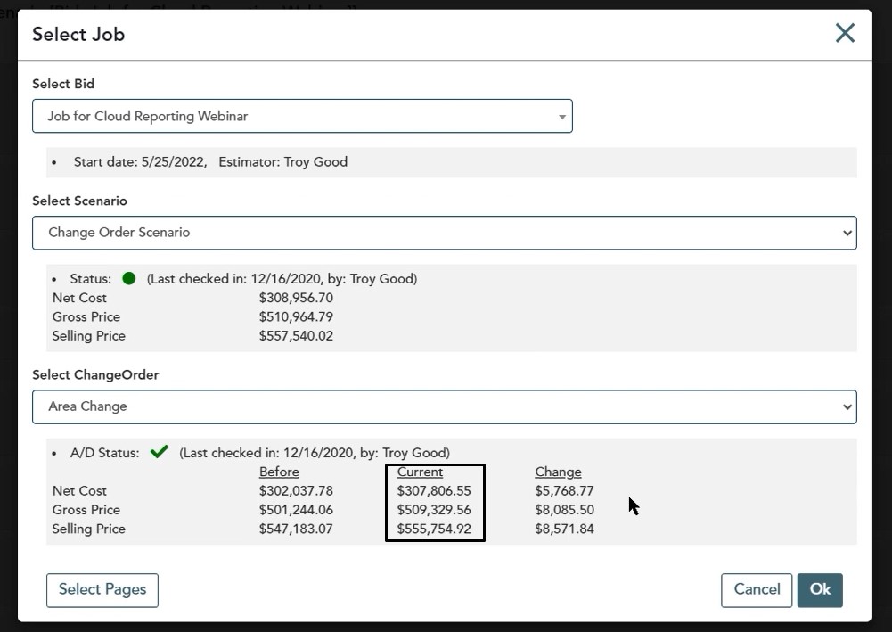 With cloud reporting, all of the information that we pull is based on the most recent checked in version of that job. So in this case, if you have your change orders checked in and or accepted, now you’re ready to go out to the portal and take a look at the reports that you have the ability to use.
