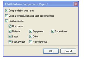 The next dialog screen to open is the Job/Database Comparison Report dialog. Here, you will select which fields, Tax Classes, Subdivisions and U/C Markups to run the comparison against. For this example, we selected everything to give you a better picture.