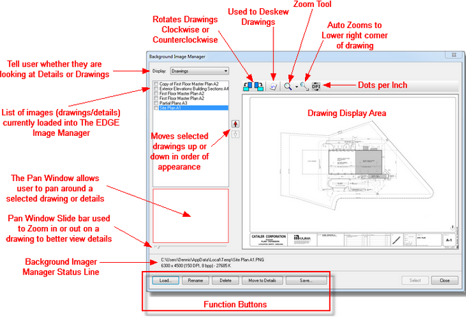 6.Many times imported images have a numeric name rather than an architectural / engineering sheet name found on all drawings. Use the Rename Function to correctly identify your drawing by name rather than numbers.Click on and select the first image listed. Then click on the button. Clicking this button opens the Background Image Name Dialog Box. Just type in the correct sheet name of the drawing and click OK.