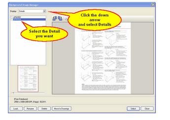 The Background Image Manager will open. At the top left corner switch the Display field from Drawing to Detail and proceed as you normally would with a standard background image. Click on the image name and press the Select button. Your detail image will then be imported into the program.