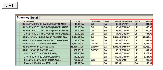 Pictured above is the Order Formula screen of the Pricing screen. The fields that appear in Green are being imported from the estimate. They can not be changed, if you have to change a quantity or EU you have to go back into the job to do it. All the fields that appear within the red rectangle can be edited in this screen. Just click in the field and start typing. If you make changes here be sure to save the changes back to the database or else they will be lost.