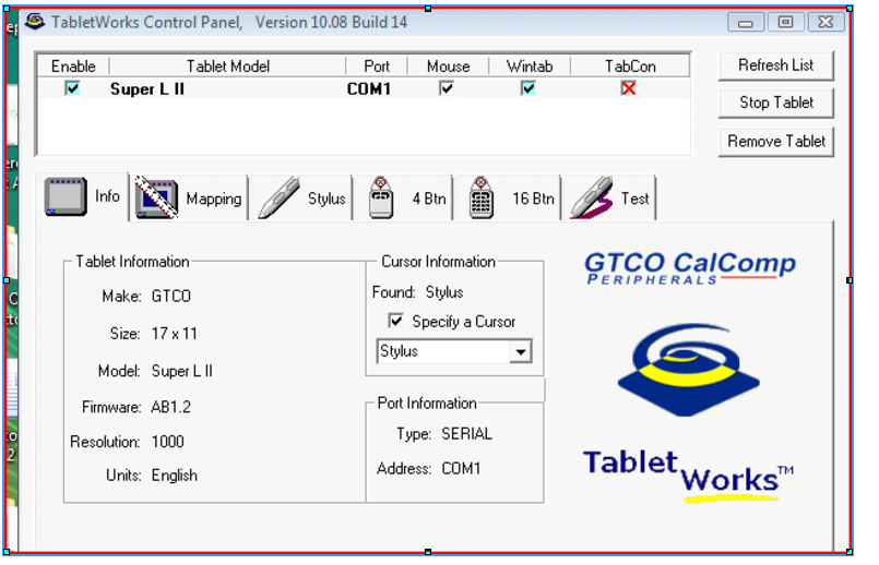 - Click the “Set Digitizer Mouse Area” button. Digitize the Upper Left corner of the digimouse menu area. (You should see coordinates appear)
