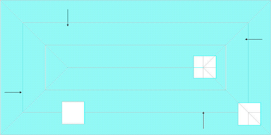 The deducted area on the left works because it is located in a single area of the tapered system and does not cross any hips, ridges or valleys. The deducted areas on the right do not work because they are located in multiple areas of the tapered system and they cross over valleys. If you see the tapered insulation lines bleeding through the deduct area after you have pressed enter then you have NOT, repeat, NOT deducted the area. The correct way to exclude an area when using the tapered insulation condition is to digitize around the item that would otherwise be deducted, for example a curb.