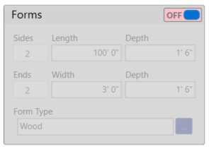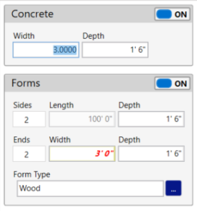 In the figure below, the cursor is on the Concrete Width field. The child field in the Forms Width is in red italics. Once the cursor moves off the parent field, the child field font will be standard and black.
