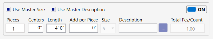 Example: Here is a Cross Bars input screen for a 4’x4’ column footing. Notice the Centers is 12”, so with Pieces set to 1, the Total Pcs/Count is 4.