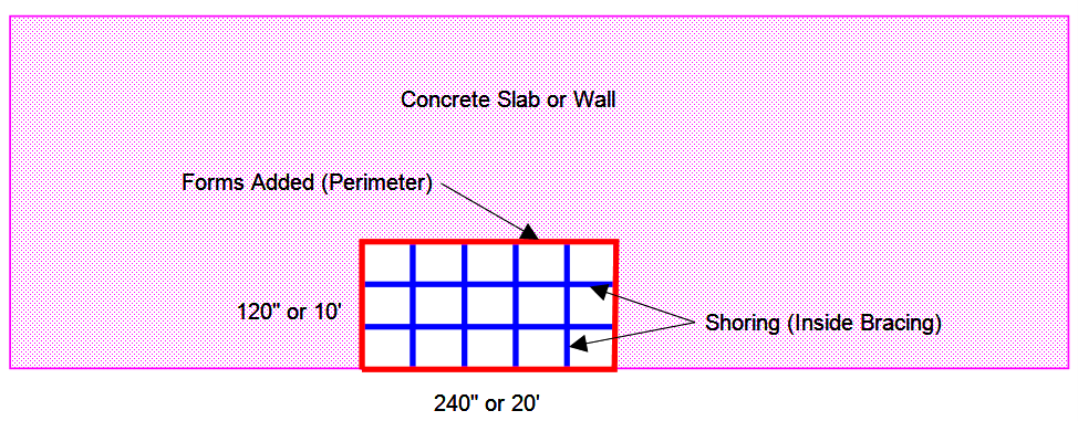 The illustration below shows an area that needs to be boxed out. In a wall, this might be for a door or window. In a slab, it might be a plumbing opening. (The perimeter and Bracing lines are for illustration only. The condition only shows a count.)