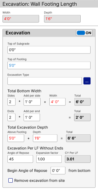 - Auto calculation – When a field is a result of other fields, it is often non-editable. Examples of this are the Lap Length for rebar or the CY Per LF for Excavation in a Wall Footing.