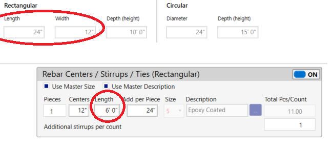 - Auto calculation but still editable – Not all auto calculation fields are non-editable. Some calculate a result, but its background is not gray. You can still edit the field. One example is the rebar Length field in the Column Count stirrups. This is auto calculated from the column dimensions but can be changed.
